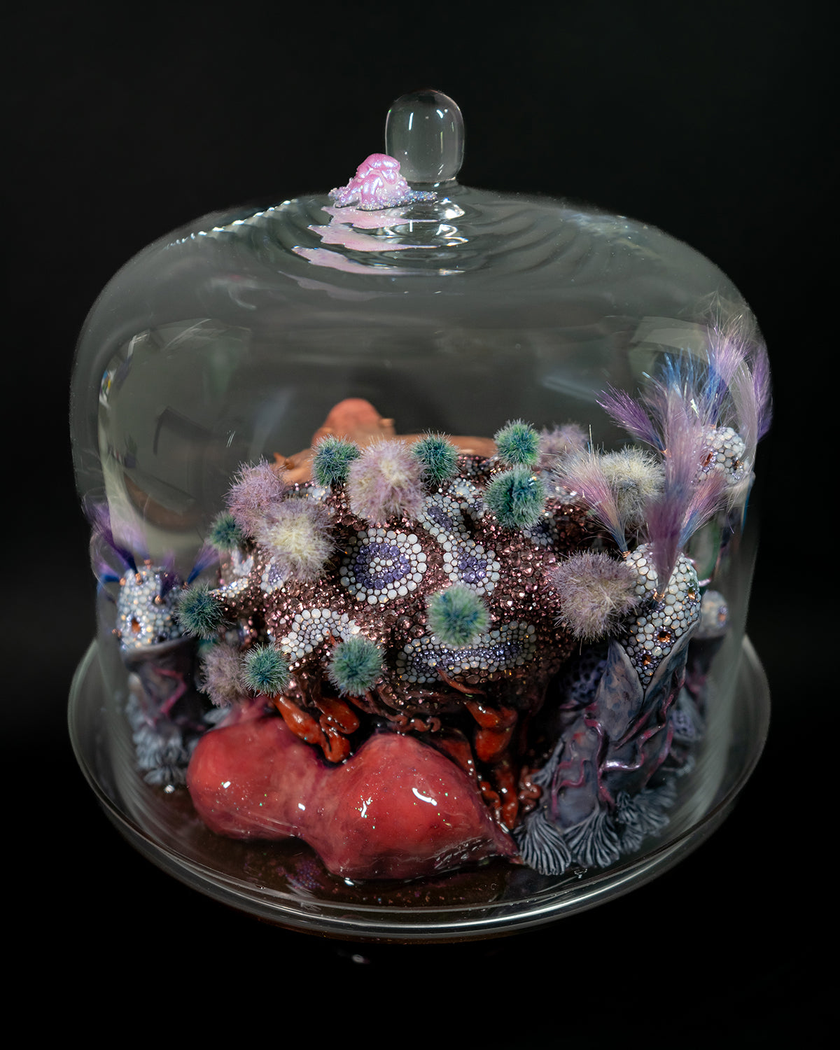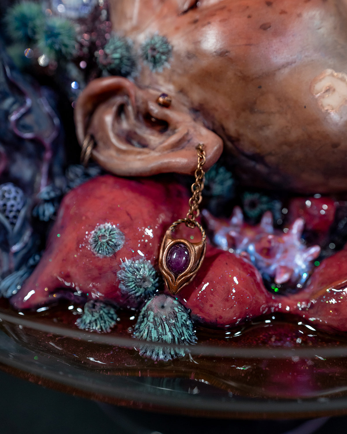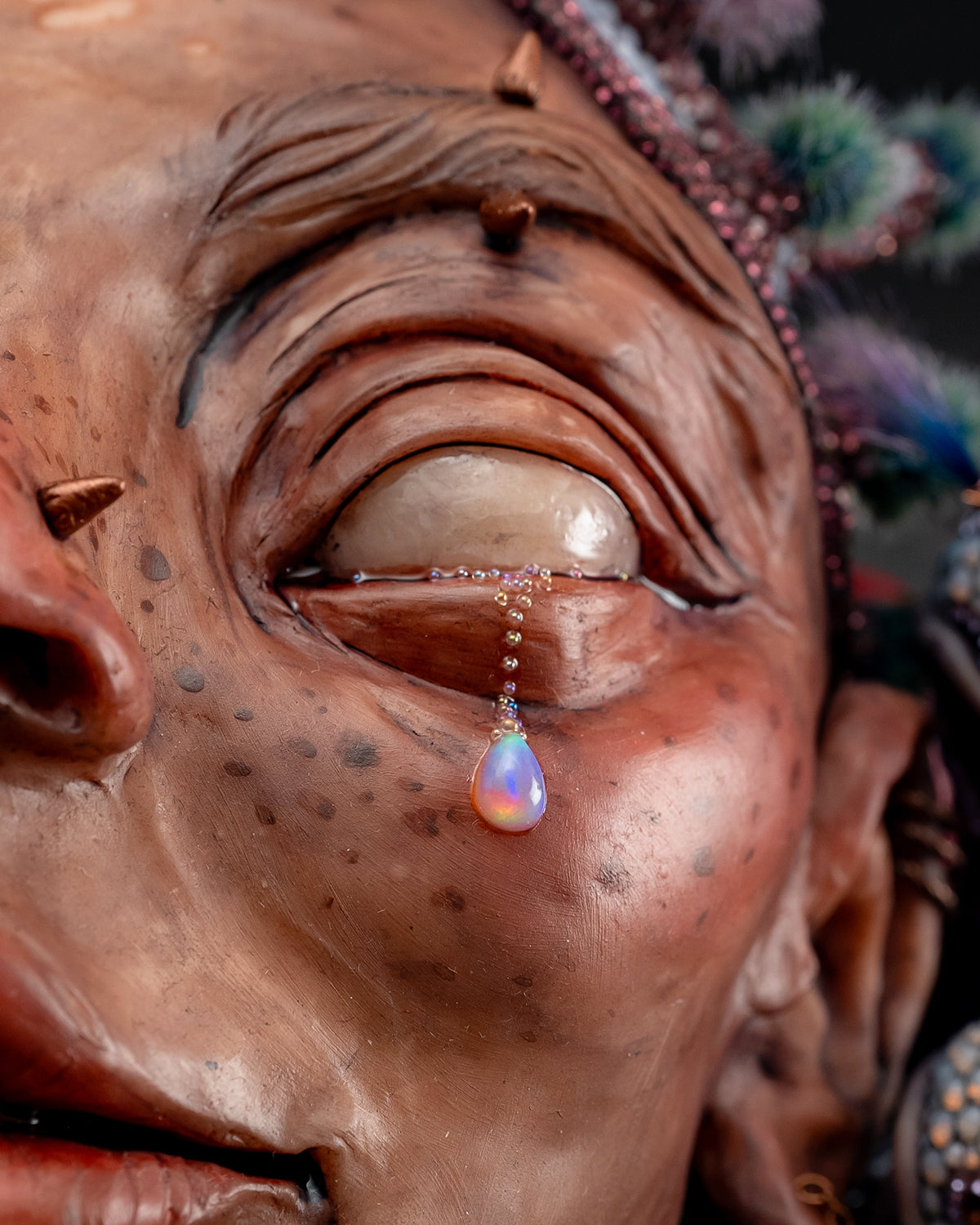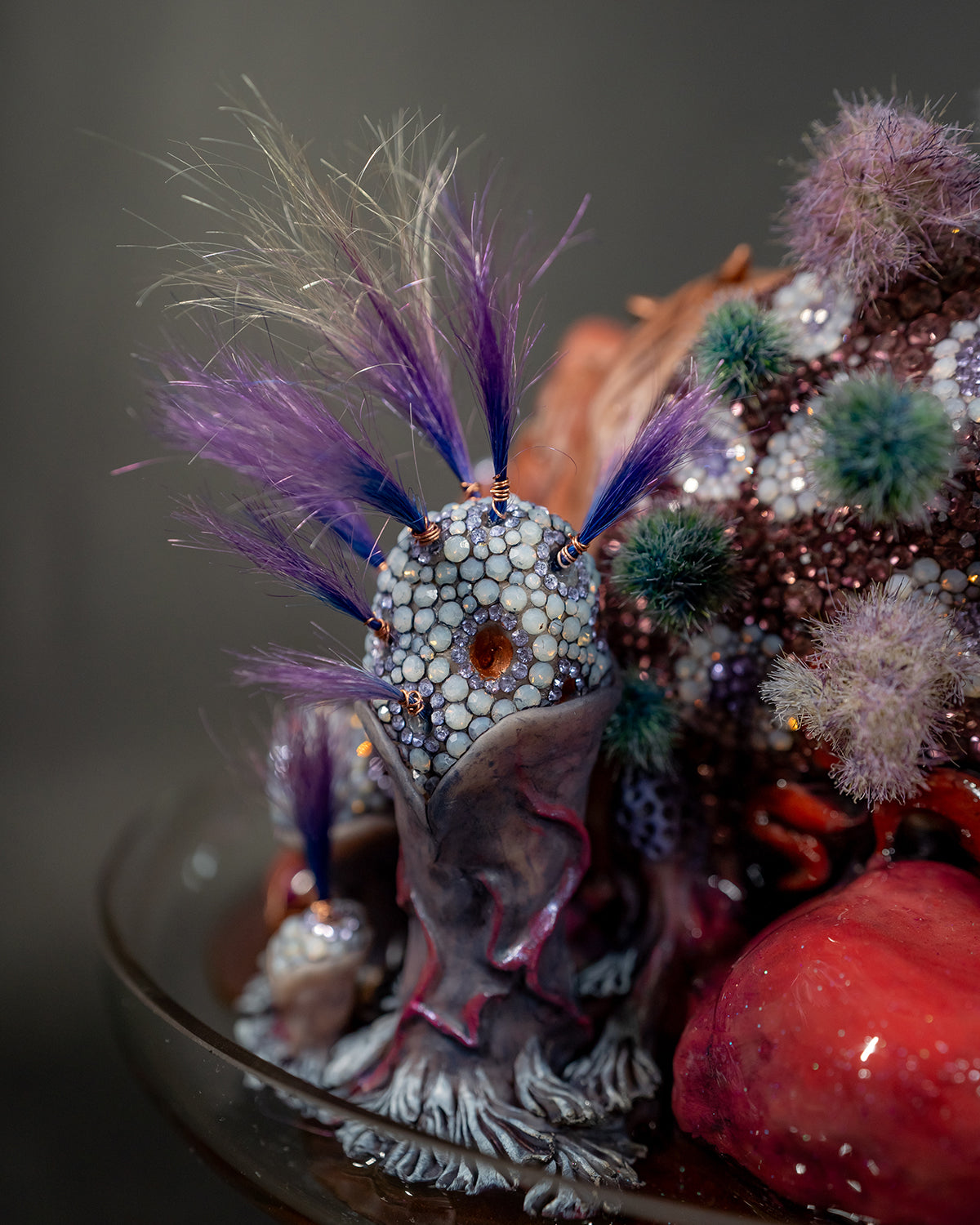Polymer clay, glass, rhinestones, resin, grass flock, genuine rubies, genuine opal, human hair, copper, acrylic paint, mica powders, 2024