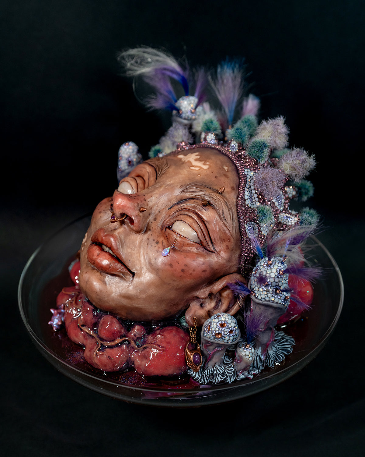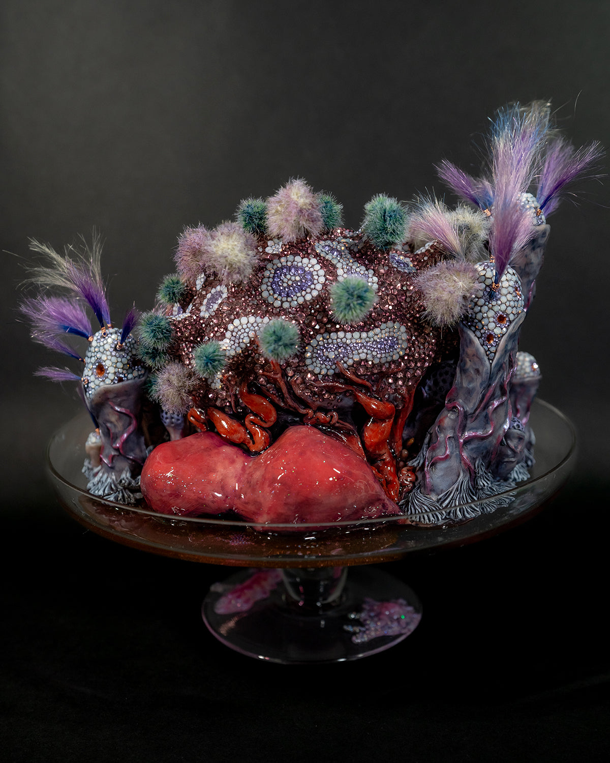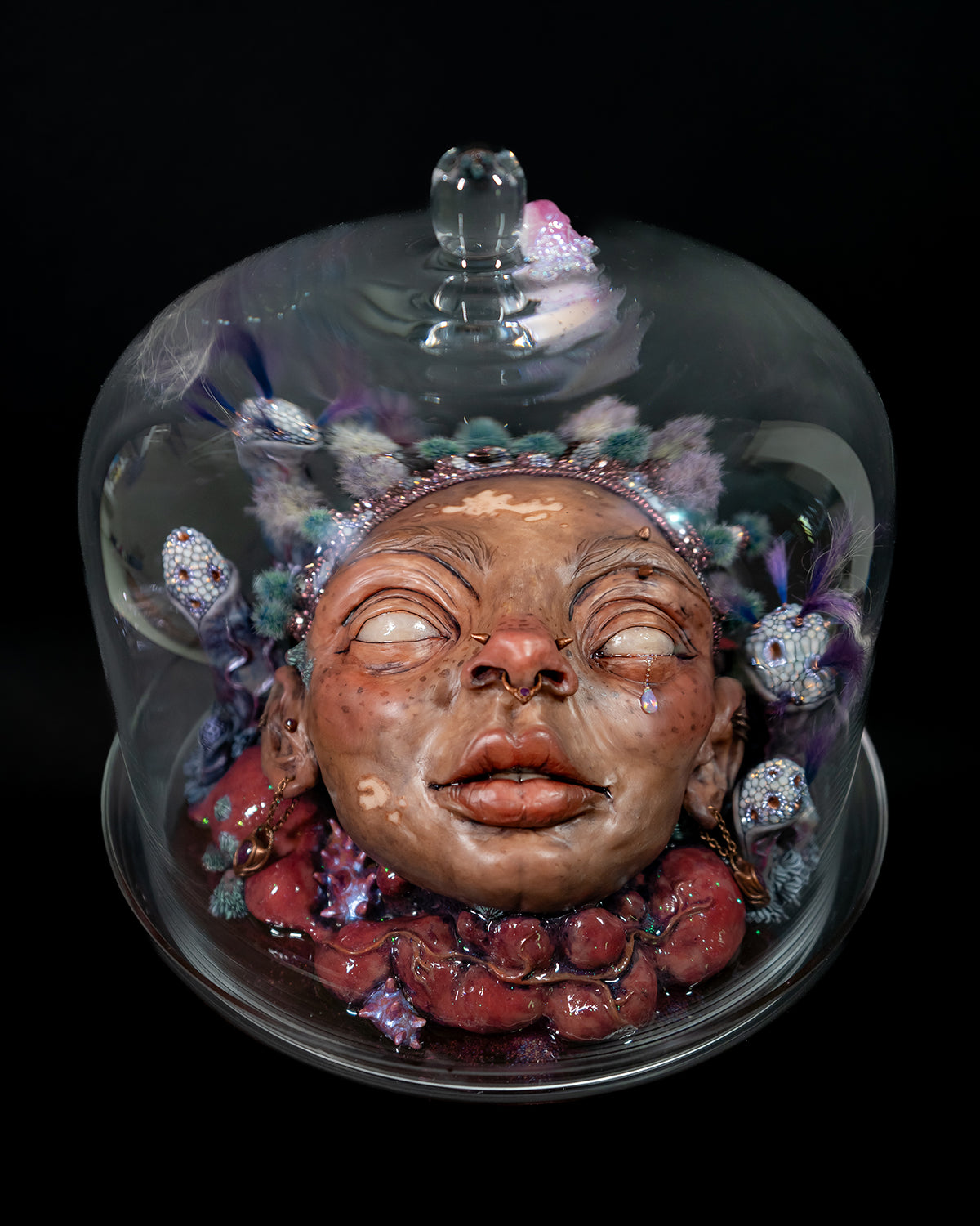 Polymer clay, glass, rhinestones, resin, grass flock, genuine rubies, genuine opal, human hair, copper, acrylic paint, mica powders, 2024