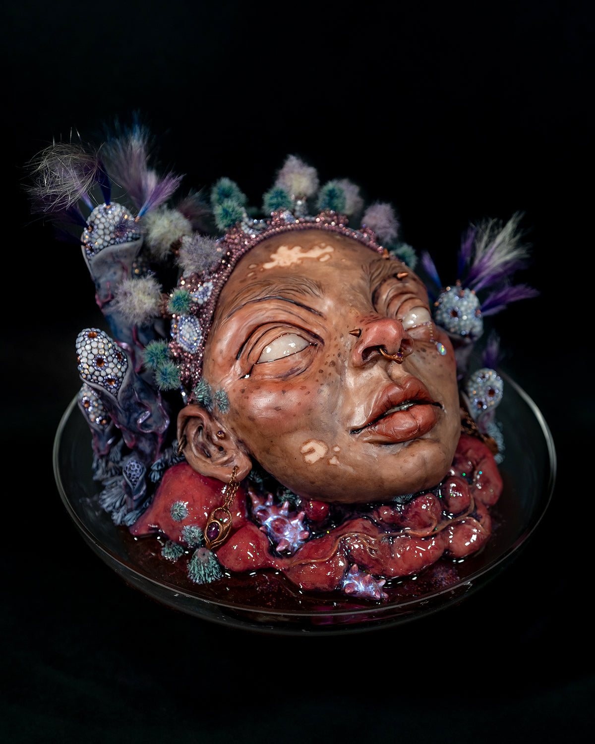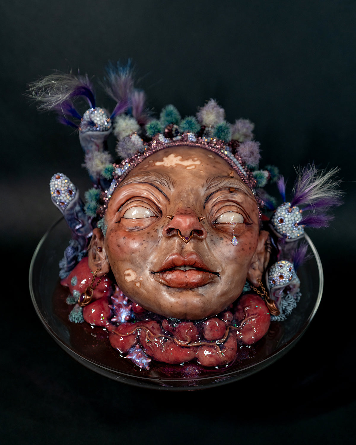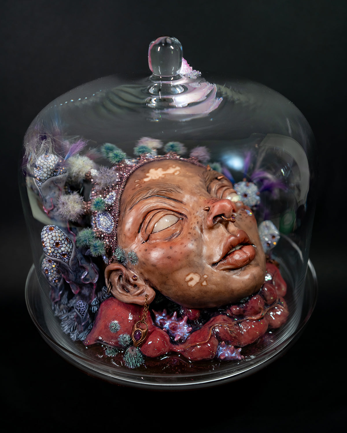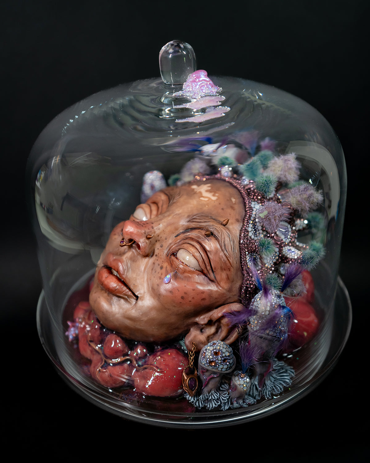 Polymer clay, glass, rhinestones, resin, grass flock, genuine rubies, genuine opal, human hair, copper, acrylic paint, mica powders, 2024