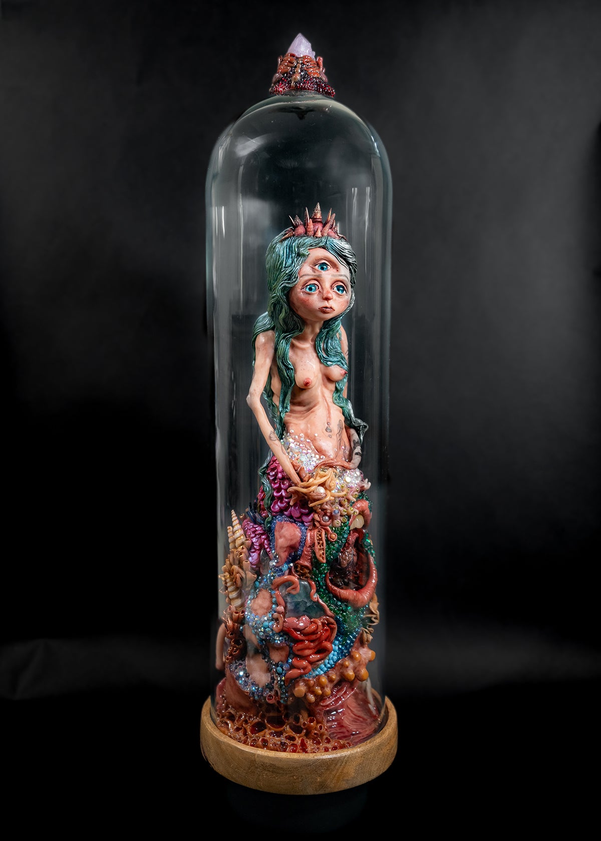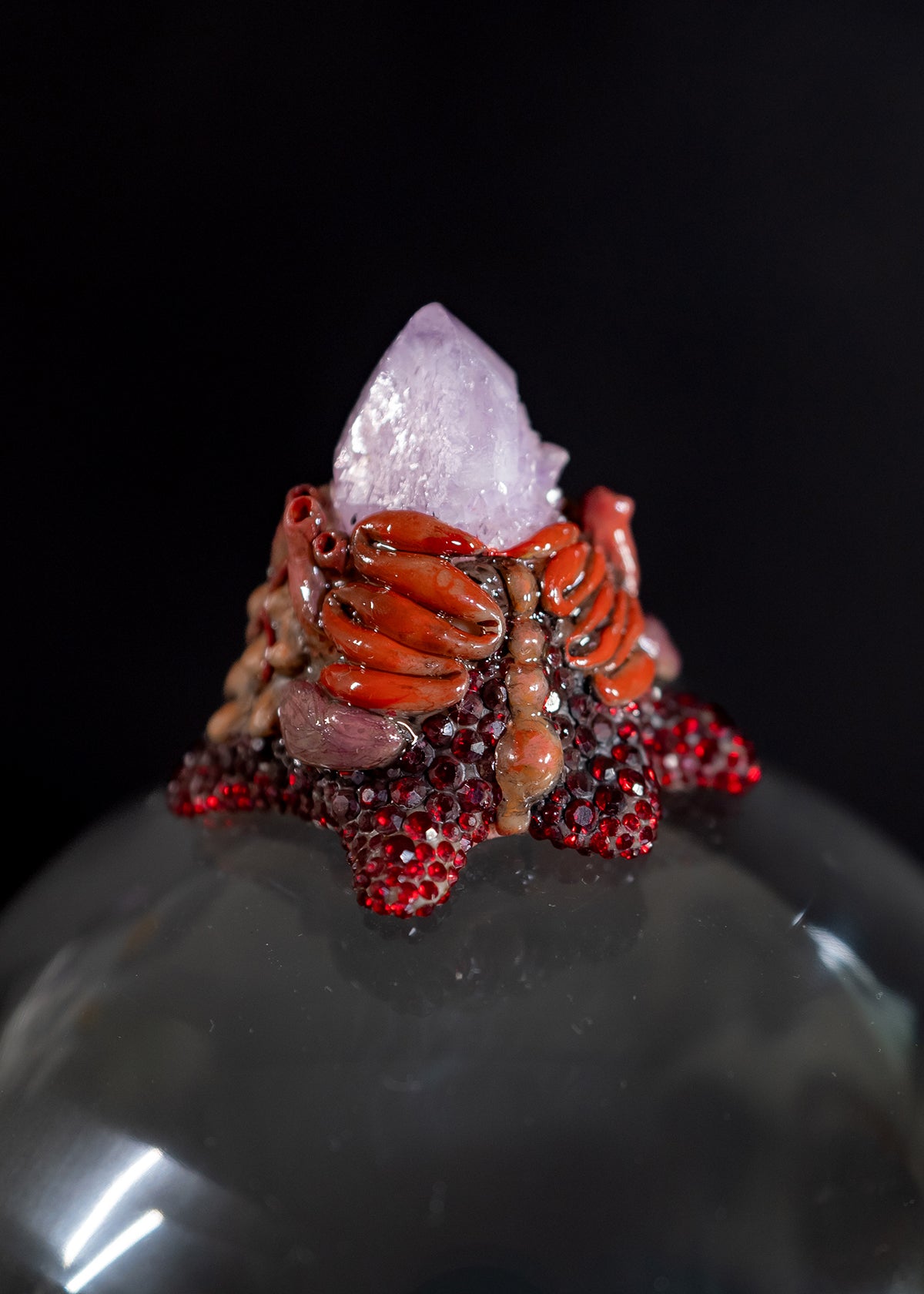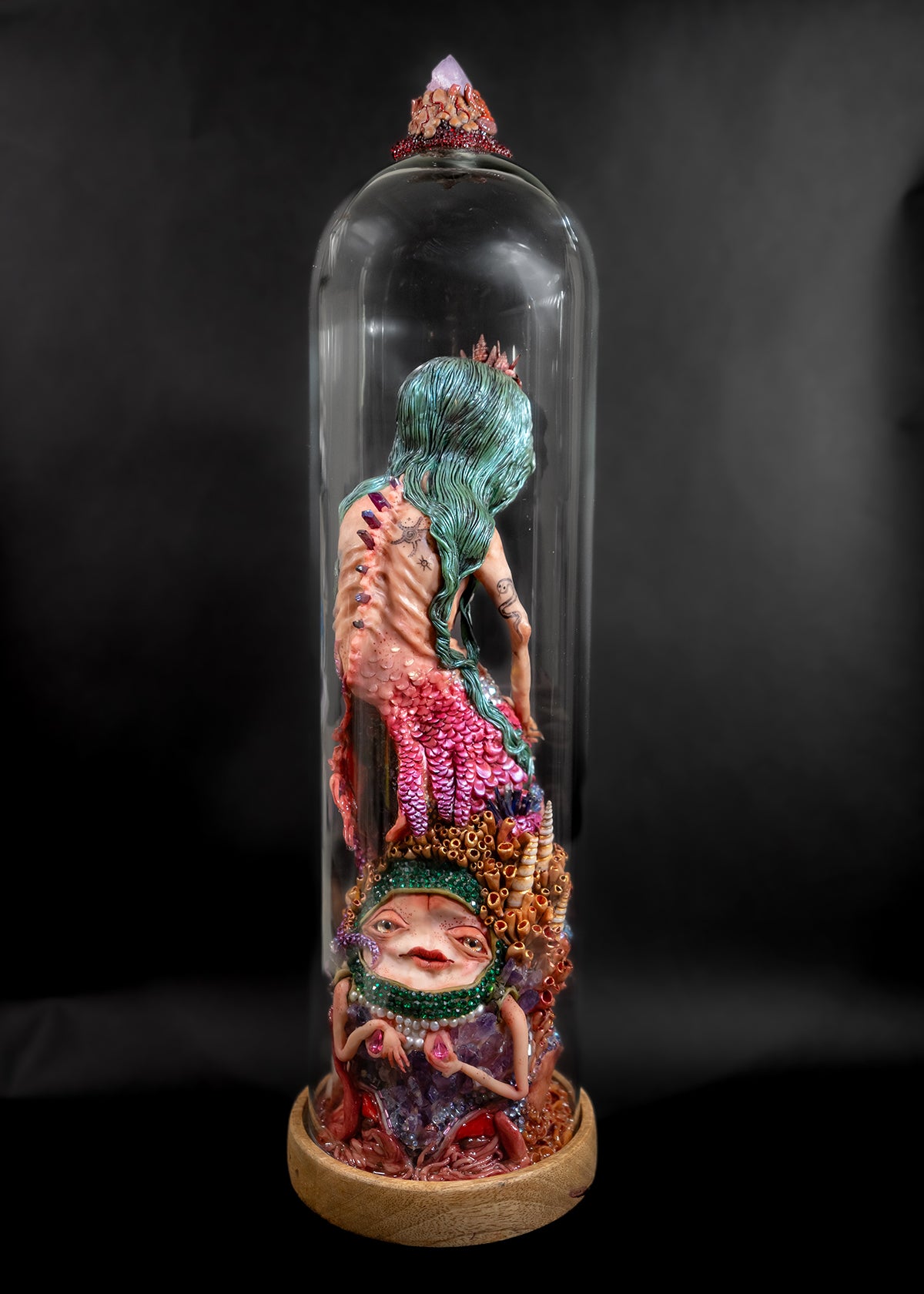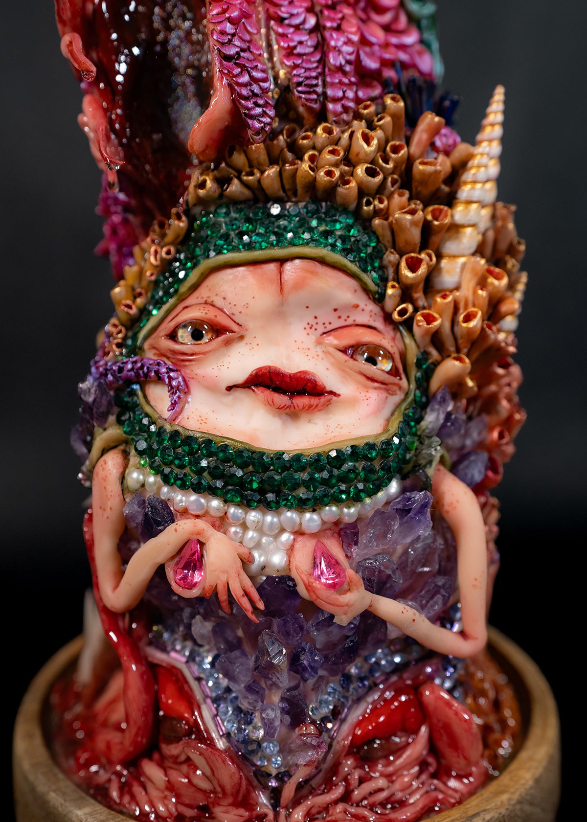 Polymer clay, glass, rhinestones, beads, resin, amethyst, fluorite, zircon, labradorite, freshwater pearls, seashells, acrylic paint, mica powders, 2024